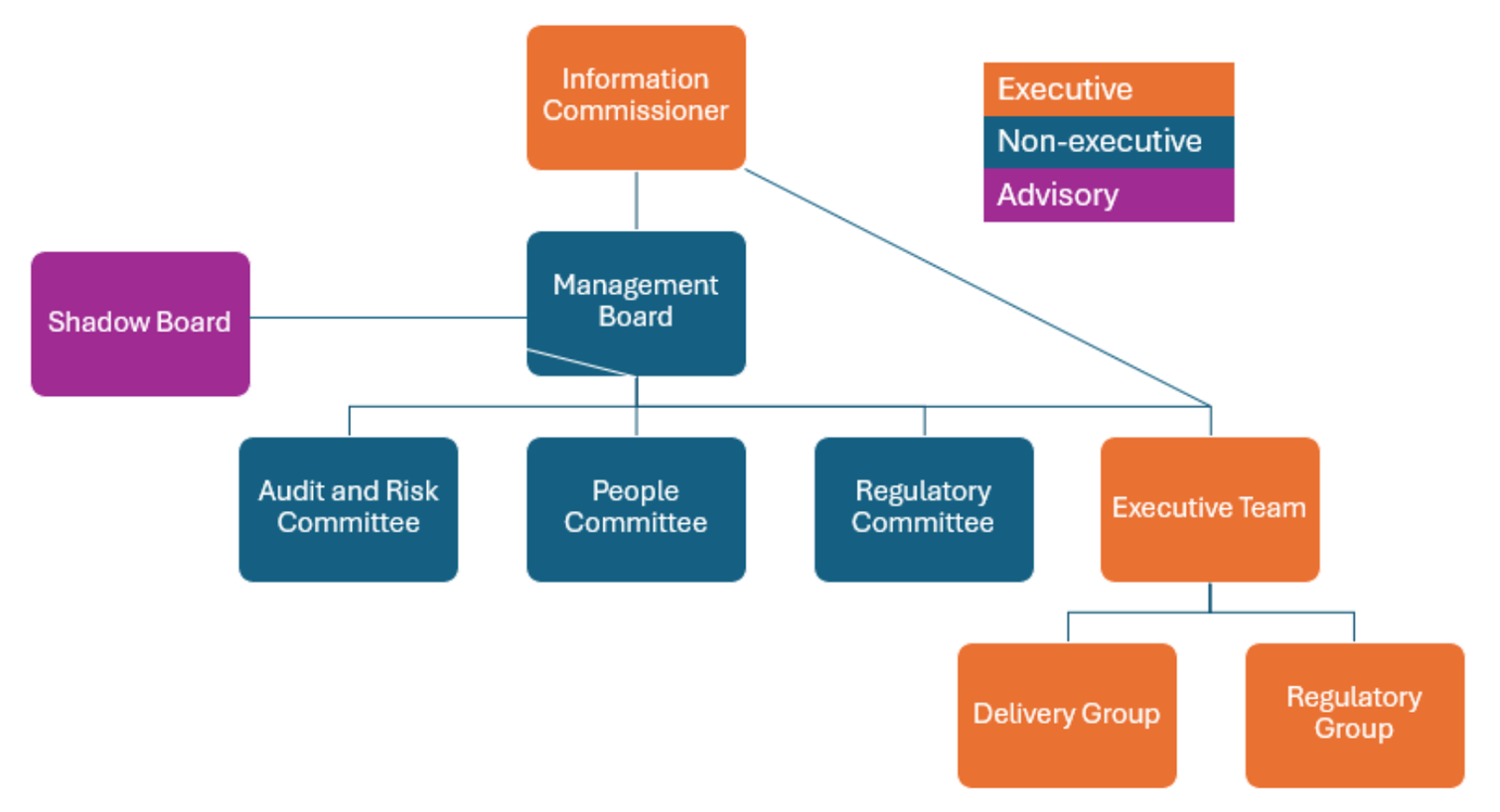 Executive Team is supported in its role by Delivery Group and Regulatory Group. Delivery Group and Regulatory Group make decisions and provide direction under delegated authority from Executive Team to ensure the effective and impactful leadership and continuous evolution of the ICO. At the time of writing (December 2024) these groups are currently operating on a pilot basis.